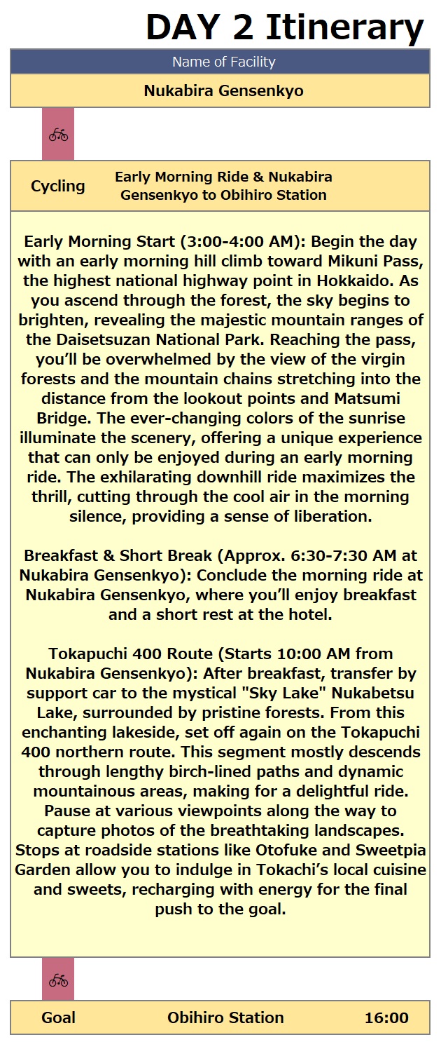 This two-day cycling journey fully embraces the National Cycle Route 'Tokapuchi 400,' featuring mountainous terrains and scenic vistas that embody the rugged beauty of Hokkaido. Each day offers a unique route that combines exhilarating rides with breathtaking landscapes and delicious local cuisine.
