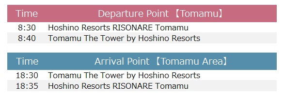 *The Operating Bus Company will be determined the day before use. We will inform you by e-mail from "tuuchi@access-n.jp" (Send-only address) to your e-mail address you registered when making a reservation. If you set are Domain specification reception, Bulk mail refusal and Receive e-mail specification, please change the setting that you can receive e-mail from "tuuchi@access-n.jp" .