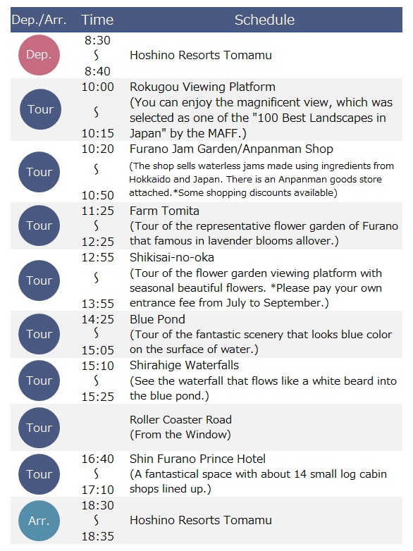 ①Enjoy the popular sightseeing spots of Biei and Furano. Such as "Shikisai no Oka" where you can enjoy beautiful flowers of every season, "Farm Tomita" which is covered in purple lavender in the peak season, and the fantastic "Blue Pond" and "Shirahige Water Falls".