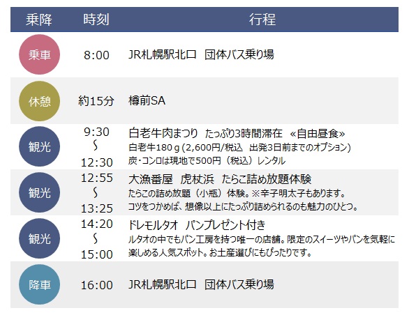 旅行代金に含まれるもの:消費税、車両費、たらこ詰め放題代、ドレモルタオのパン(メロンパン)プレゼント、白老牛180g(白老牛セットプランでお申し込みのお客様、またはご乗車日の3日前までにオプションをお申し込みいただいたお客様に限ります)。